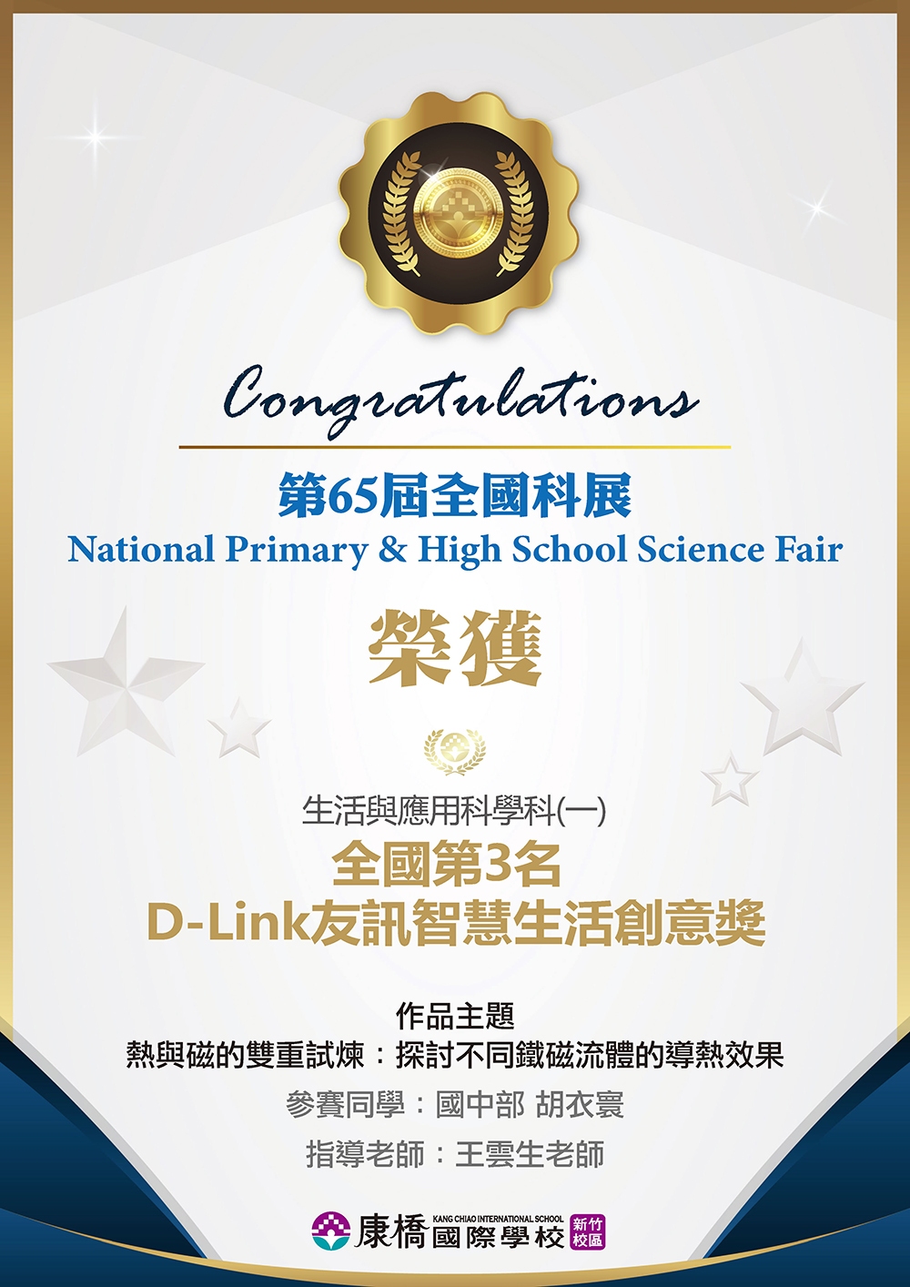 403孫翊晴 榮獲四年級組 貳等獎。 703陳禹 榮獲七年級組 參等獎。 701劉宜樺 榮獲七年級組 優等獎。 801吳弈德 榮獲八年級組 參等獎。 803王云恩 榮獲八年級組 參等獎。 804王沛晴 榮獲八年級組 參等獎。 |