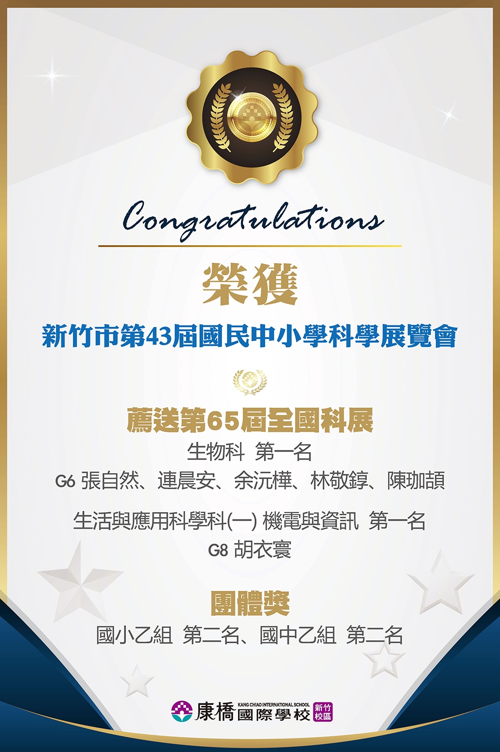 賀!本校國中部學生組隊參加「新竹市114學年度國中奧林匹亞科學競賽」榮獲佳績!